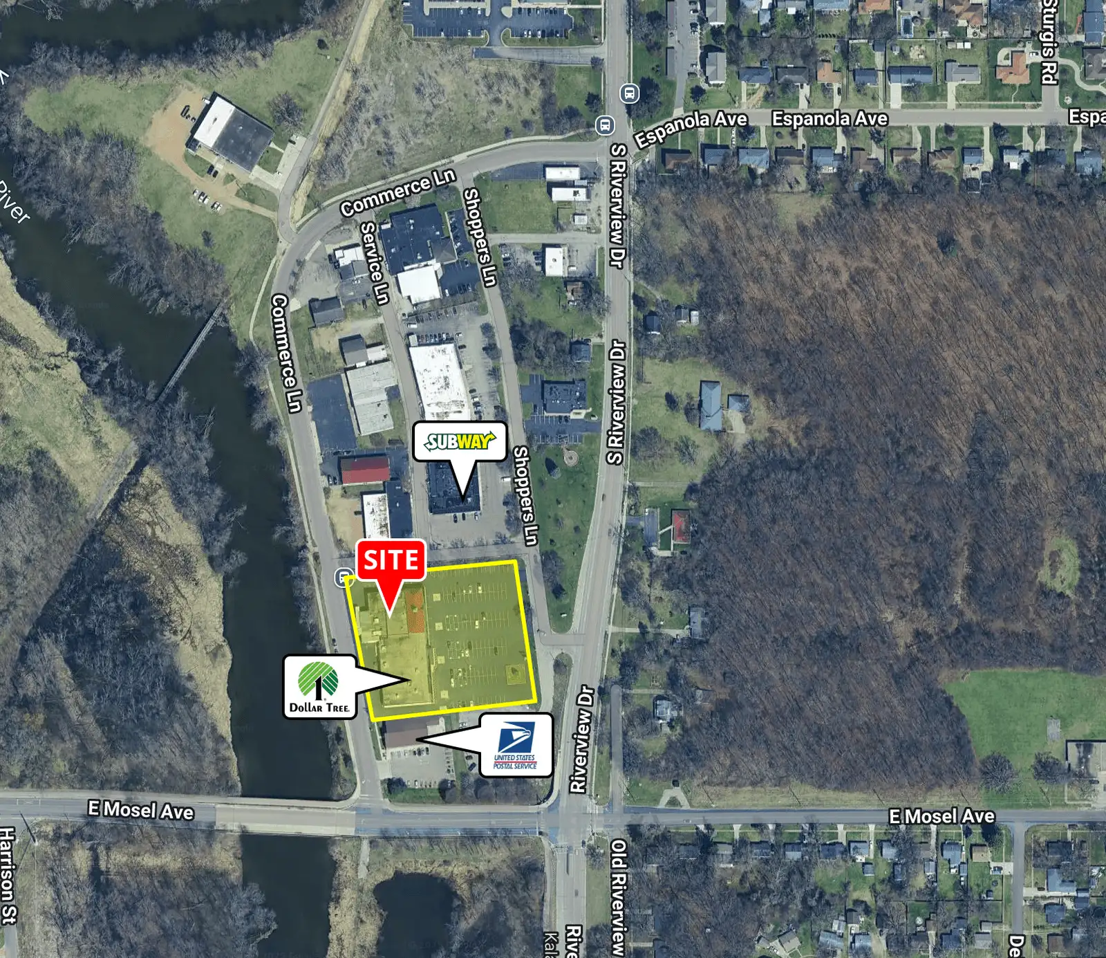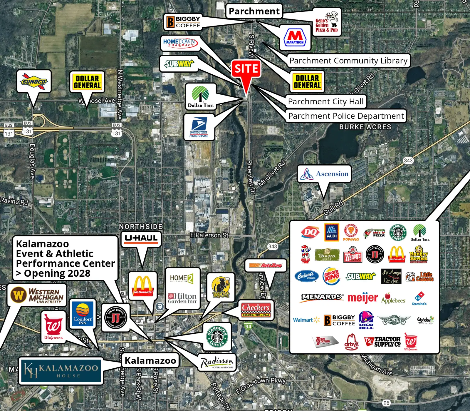 • Located on the northwest quadrant of S. Riverview Drive and Mosel Avenue, between Commerce Lane and Shoppers Lane, in Parchment, MI