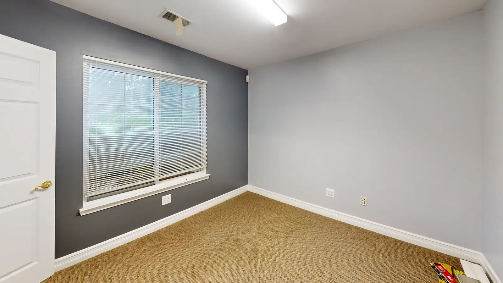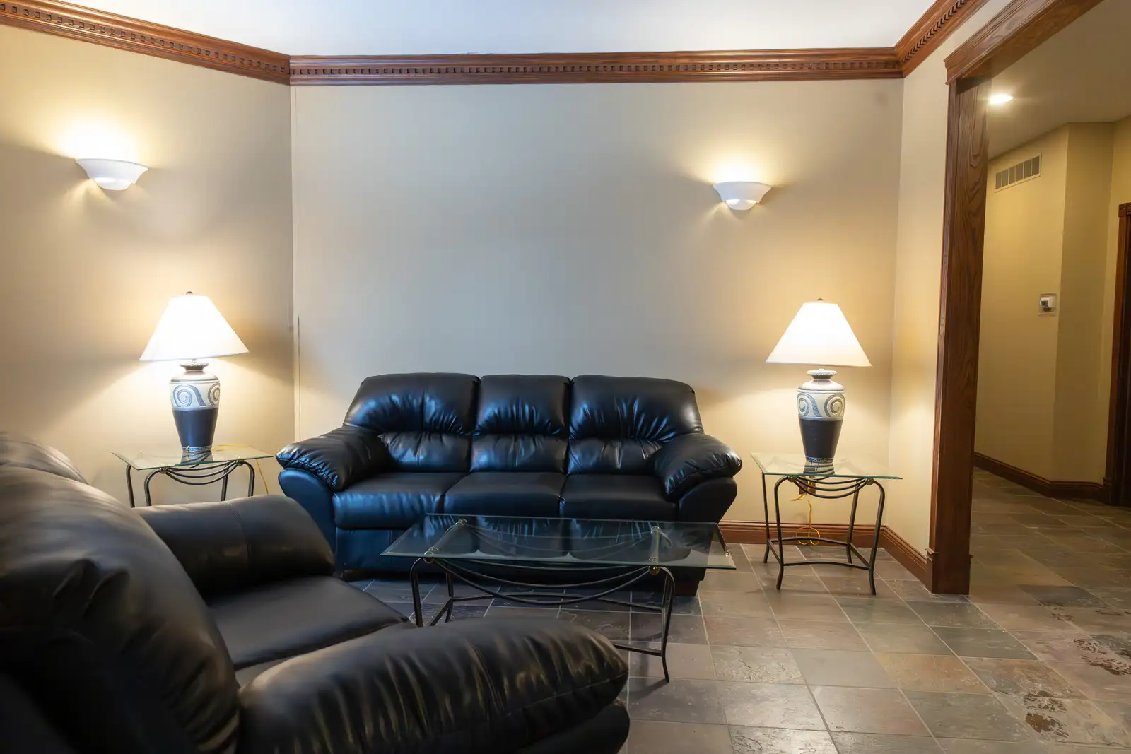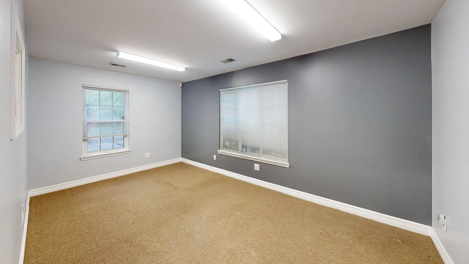 This endcap office suite features a very efficient space plan with a waiting area, kitchenette and three private offices.