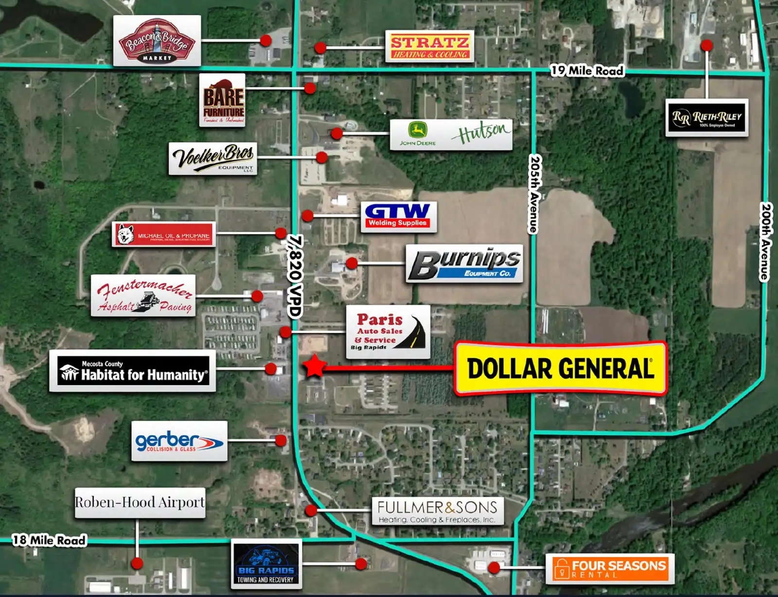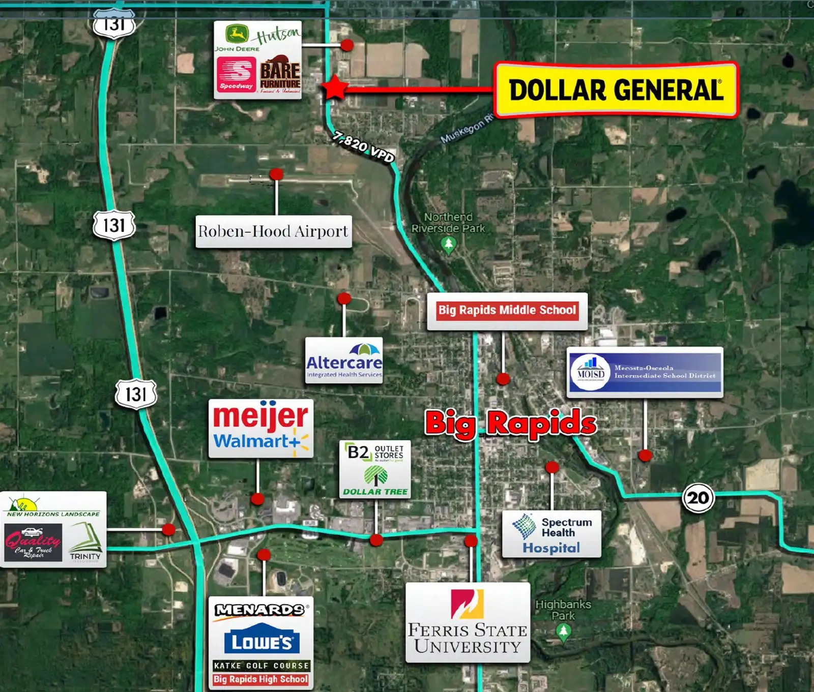 Terrific investment opportunity for a 10,760 SF Dollar General Plus store located in Big Rapids, MI the home of Ferris State University. Built new in September 2021, this property offers an investor an Absolute NNN Lease with zero landlord responsibilities, and a corporate guaranteed lease by Dollar General Corporation which holds an S&P Global Rating of BBB. The store is highly visible with strong traffic patterns and good demographics. The original lease was for 15 years starting on September 15, 2021 with 10% bumps every 5 years. There are also 4 (5 year) options with 10% bumps at each option. The current NOI is $91,531 with an increase to $100,684.10 in September 2026. This investment is priced at $1,425,000 representing a 6.42% Cap Rate or $132.43 psf. This is an ideal investment for a 1031 Buyer or someone looking for “passive” income.