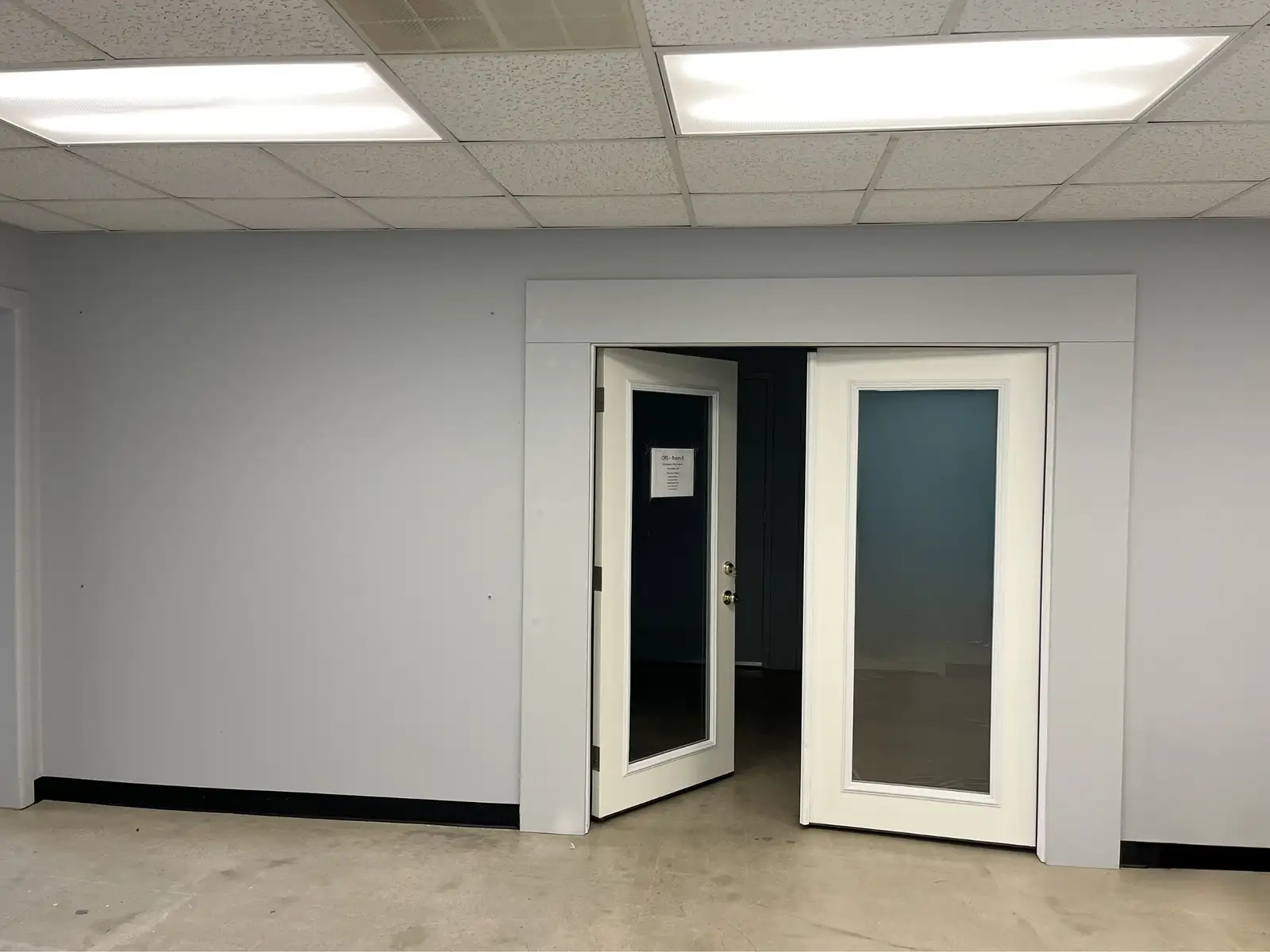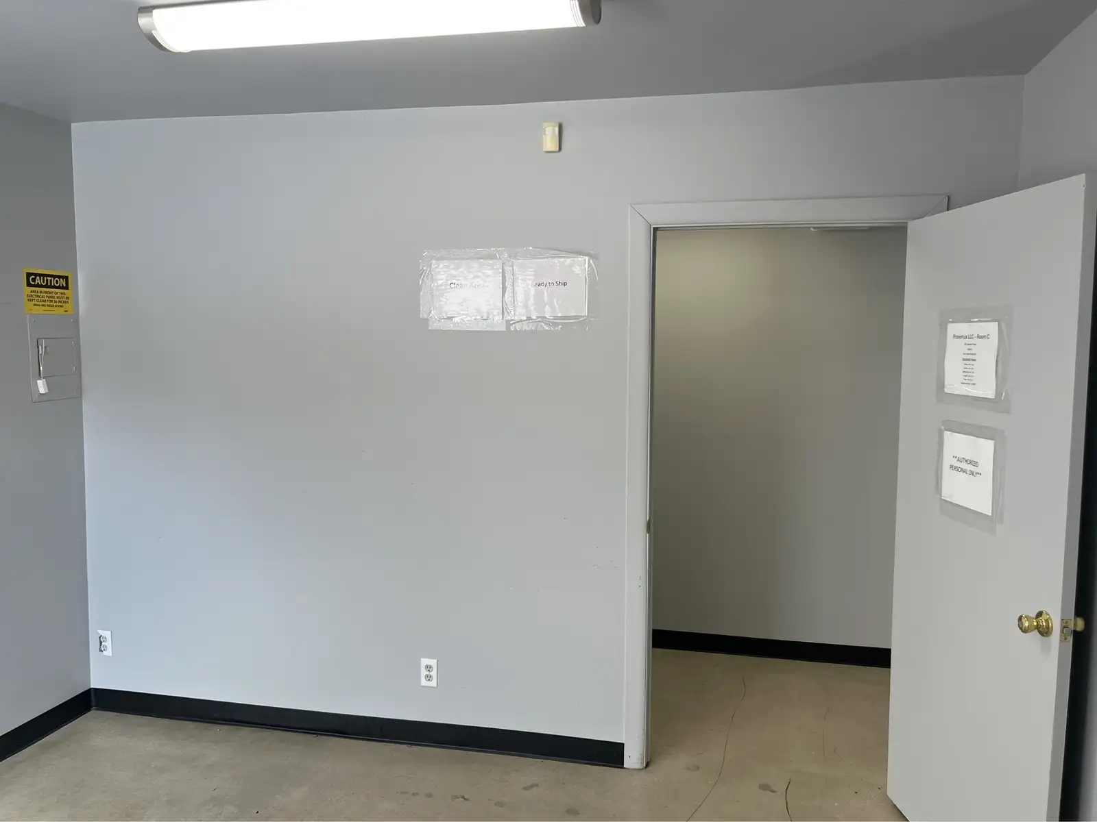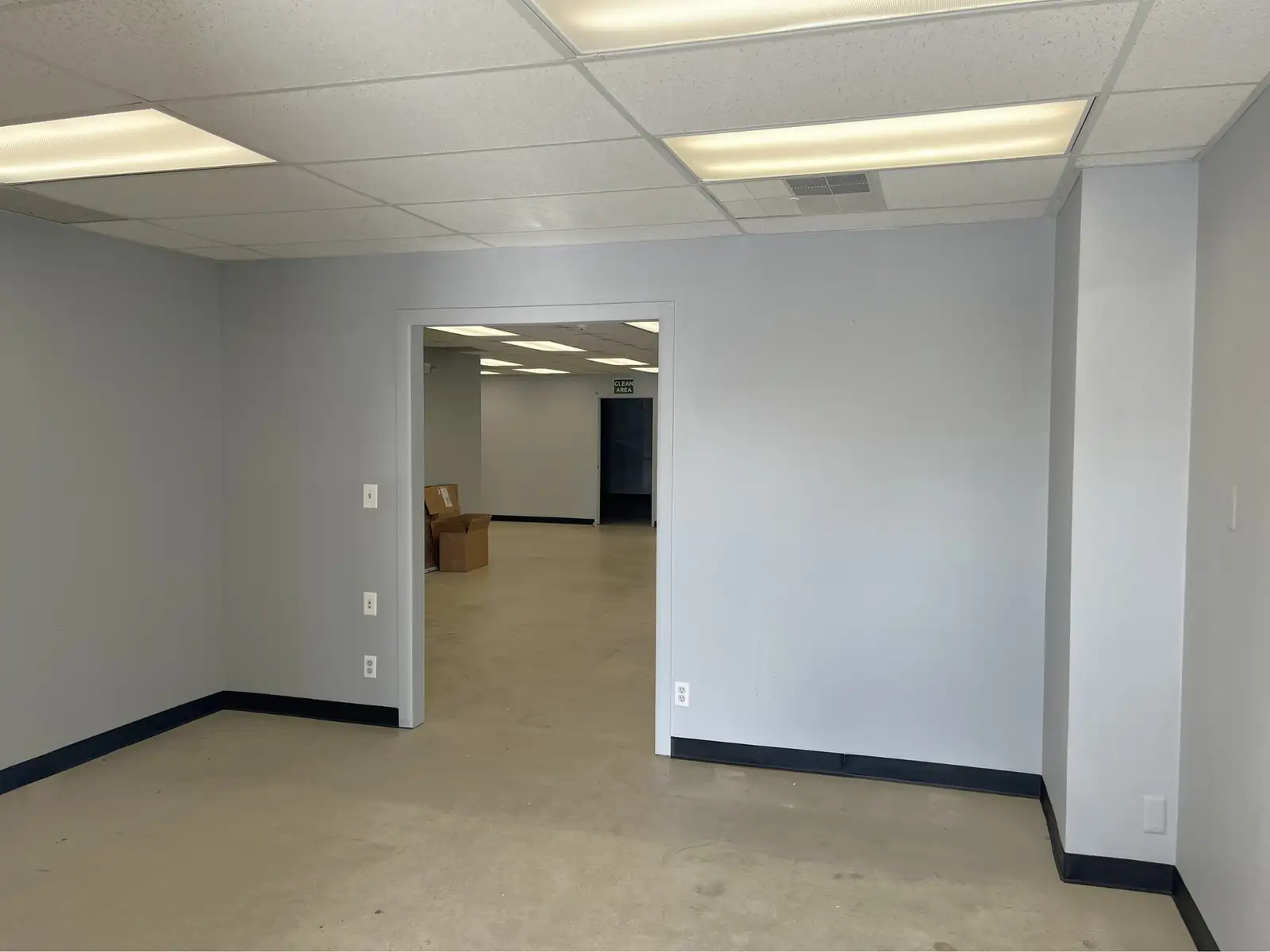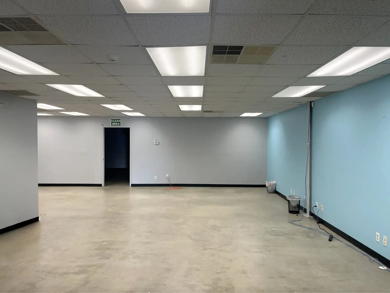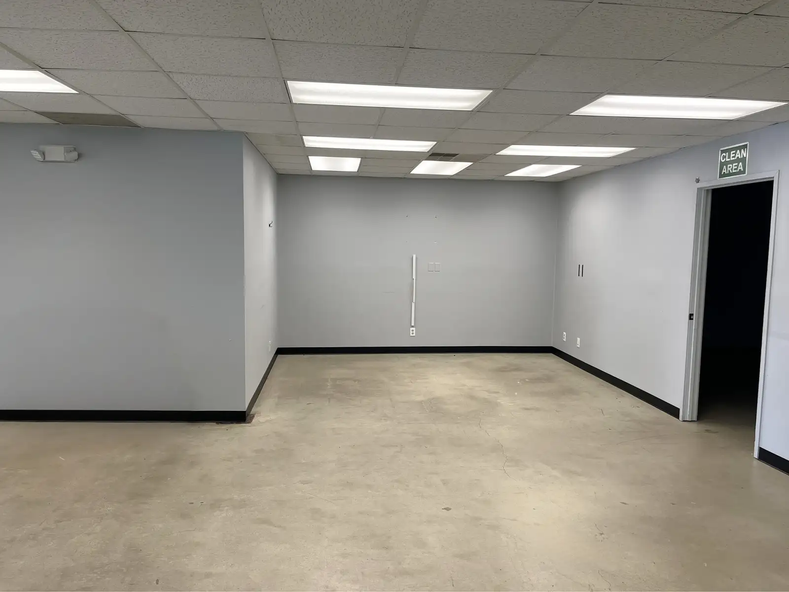 The property features an open, well-lit warehouse area with a 12’ x 10’ drive-in overhead door, providing efficient access for storage, light industrial use, or operational support; and has a 14’ ceiling height with an 11’ clearance. Interior improvements include multiple finished rooms ideal for tech, lab, studio, research, or clean workspace applications, with professional separation via glass double-door entries.