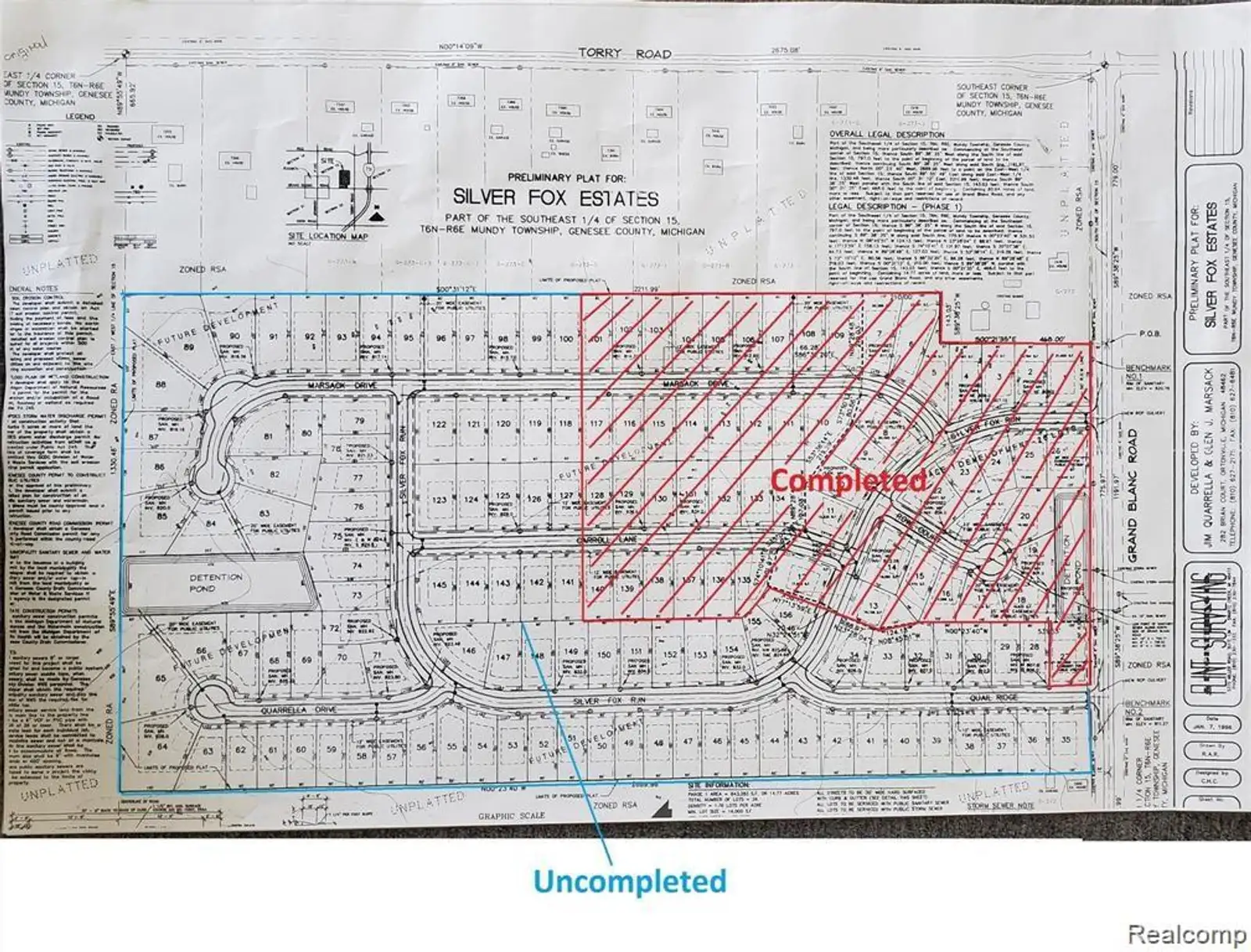 Prime Development Opportunity Exceptional 50-acre vacant land parcel ideally located just ¼ mile off US-23, between Swartz Creek and Grand Blanc. This well-maintained property sits within a caring neighborhood and is planned for future phases of the successful Silver Fox Estates subdivision. Originally designed for 99+ single-family homes, the property includes conceptual residential plans. Sewer and gas utilities are available along W Grand Blanc Road, and the site offers multiple access points, including a primary entrance from Grand Blanc Road with additional connections to Marsack Drive, Carroll Lane, and Silver Fox Run. Homes in Silver Fox Estates have demonstrated strong value retention, making this an outstanding opportunity for residential developers seeking location, infrastructure, and long-term appeal. (Includes add'l #15154000029 3170 Grand Blanc Rd)