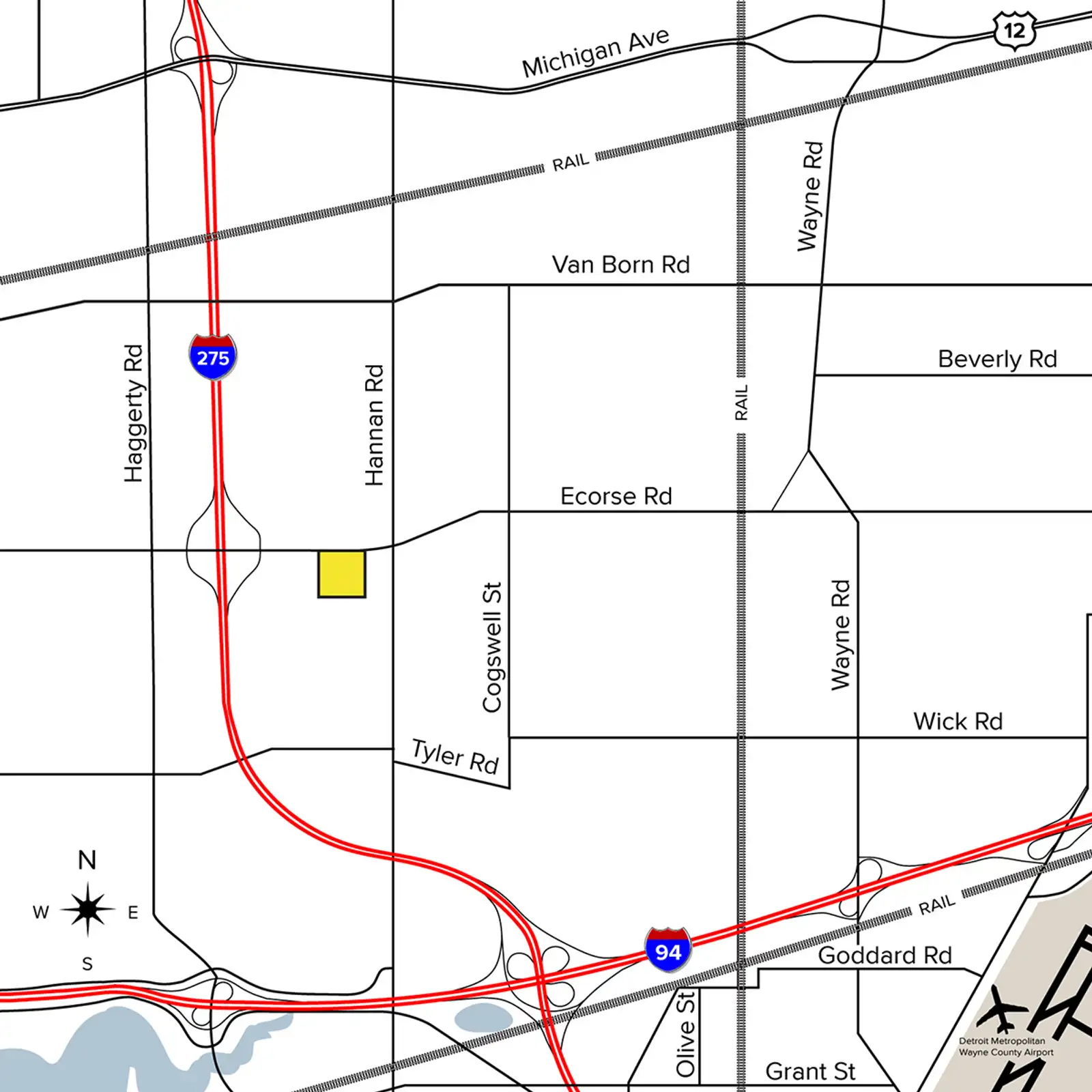 Master planned mixed-use immediately east of Visteon Way with 905' frontage on new Ecorse Road Boulevard with median.