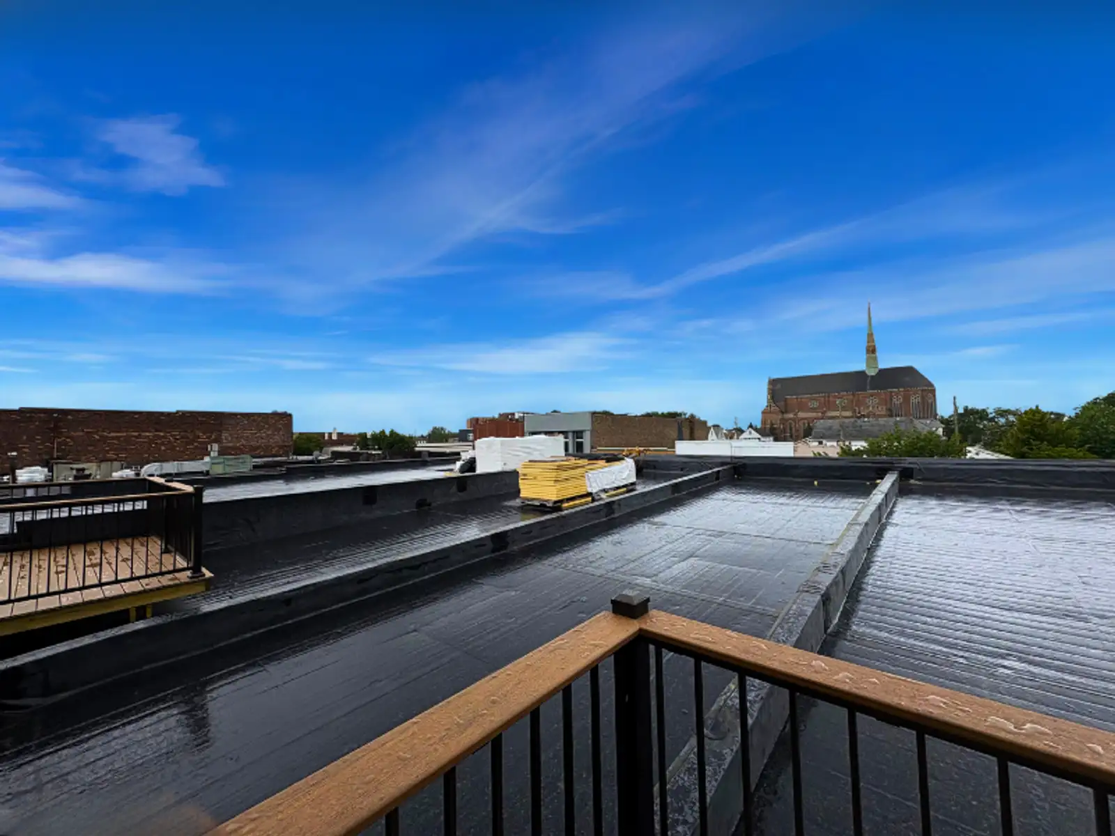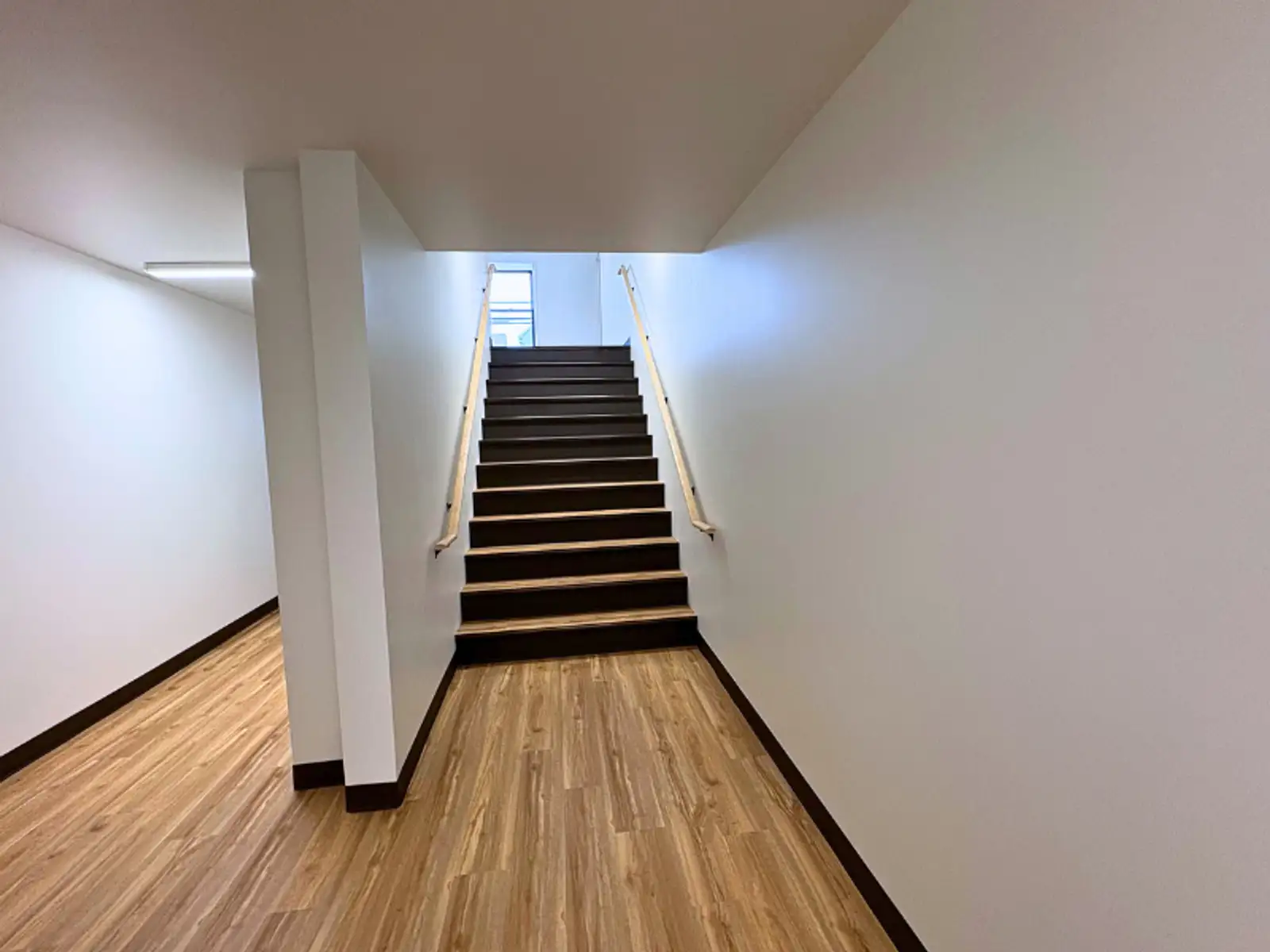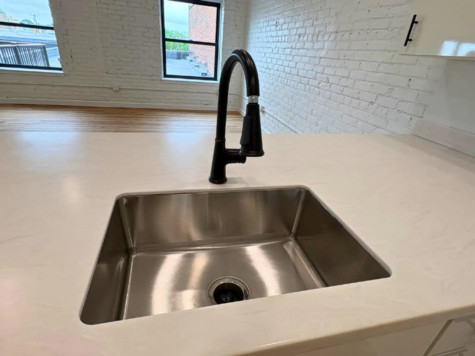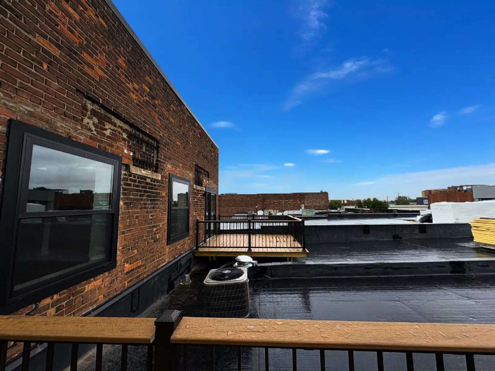 This newly renovated one-bedroom loft is located above a commercial space on Joseph Campau Ave in Hamtramck. The unit has a private entry through the storefront, leading up a dedicated stairwell to the loft. Inside, there’s an open living and kitchen area with white cabinets, laminate countertops, a large island with a stainless steel sink, and a gooseneck kitchen faucet. The space features exposed ductwork, recessed lighting, skylights, white brick accent walls, and vinyl plank flooring throughout. The bedroom includes a ceiling fan, closet, and natural light. The full bathroom has a walk-in shower, tile flooring, and built-in shower shelves. A private walk-out deck with black railing and a sliding glass door completes the unit.