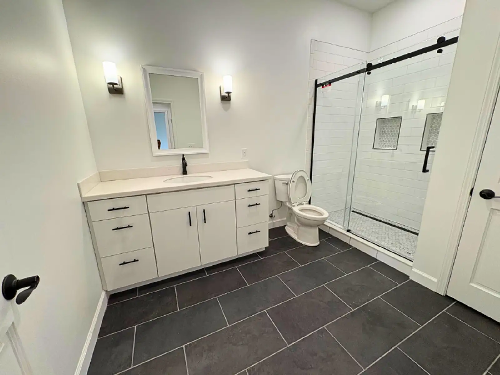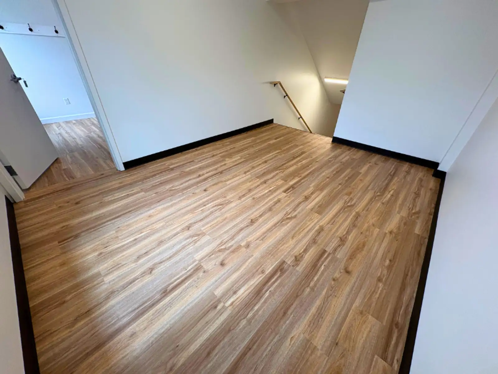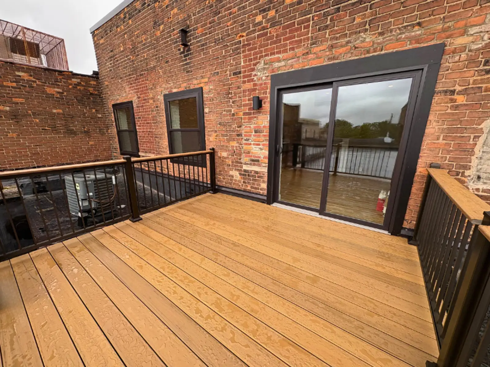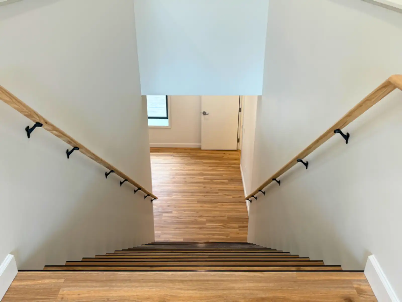 This newly renovated one-bedroom loft is located above a commercial space on Joseph Campau Ave in Hamtramck. The unit has a private entry through the storefront, leading up a dedicated stairwell to the loft. Inside, there’s an open living and kitchen area with white cabinets, laminate countertops, a large island with a stainless steel sink, and a gooseneck kitchen faucet. The space features exposed ductwork, recessed lighting, skylights, white brick accent walls, and vinyl plank flooring throughout. The bedroom includes a ceiling fan, closet, and natural light. The full bathroom has a walk-in shower, tile flooring, and built-in shower shelves. A private walk-out deck with black railing and a sliding glass door completes the unit.