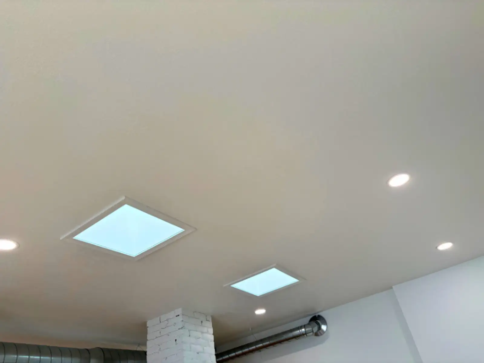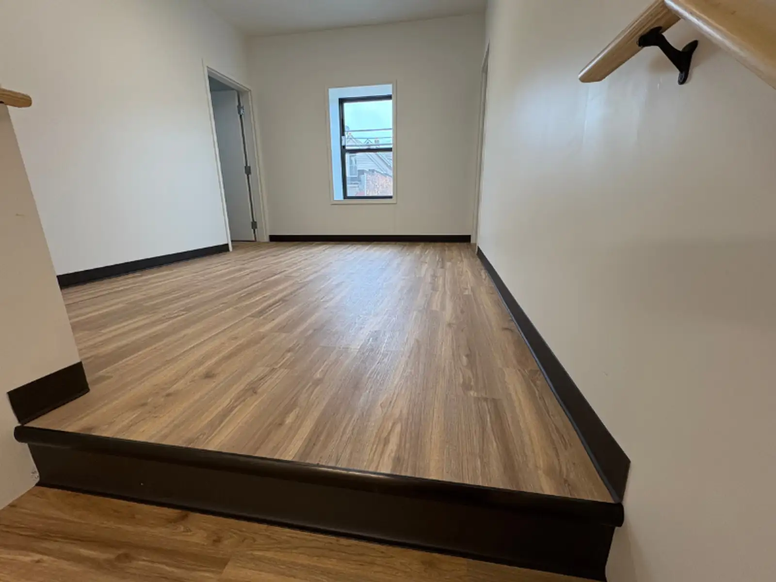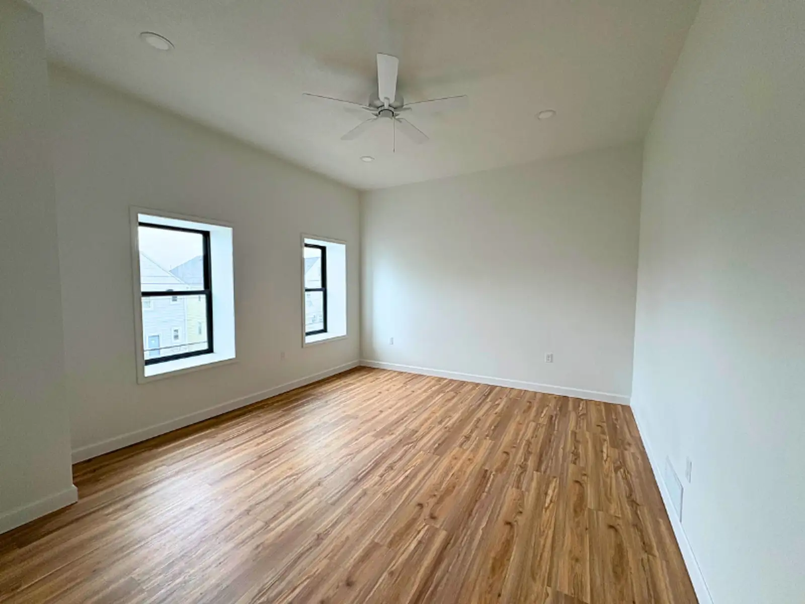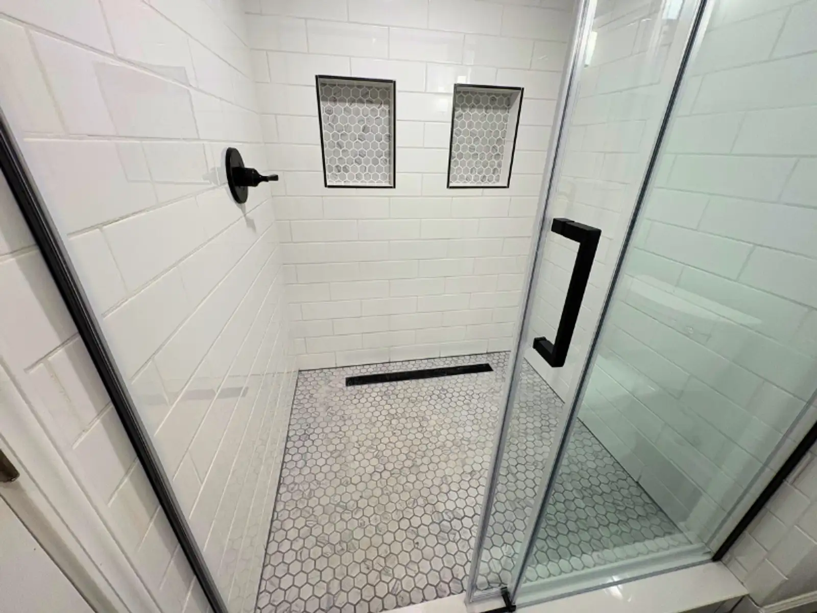 This newly renovated one-bedroom loft is located above a commercial space on Joseph Campau Ave in Hamtramck. The unit has a private entry through the storefront, leading up a dedicated stairwell to the loft. Inside, there’s an open living and kitchen area with white cabinets, laminate countertops, a large island with a stainless steel sink, and a gooseneck kitchen faucet. The space features exposed ductwork, recessed lighting, skylights, white brick accent walls, and vinyl plank flooring throughout. The bedroom includes a ceiling fan, closet, and natural light. The full bathroom has a walk-in shower, tile flooring, and built-in shower shelves. A private walk-out deck with black railing and a sliding glass door completes the unit.