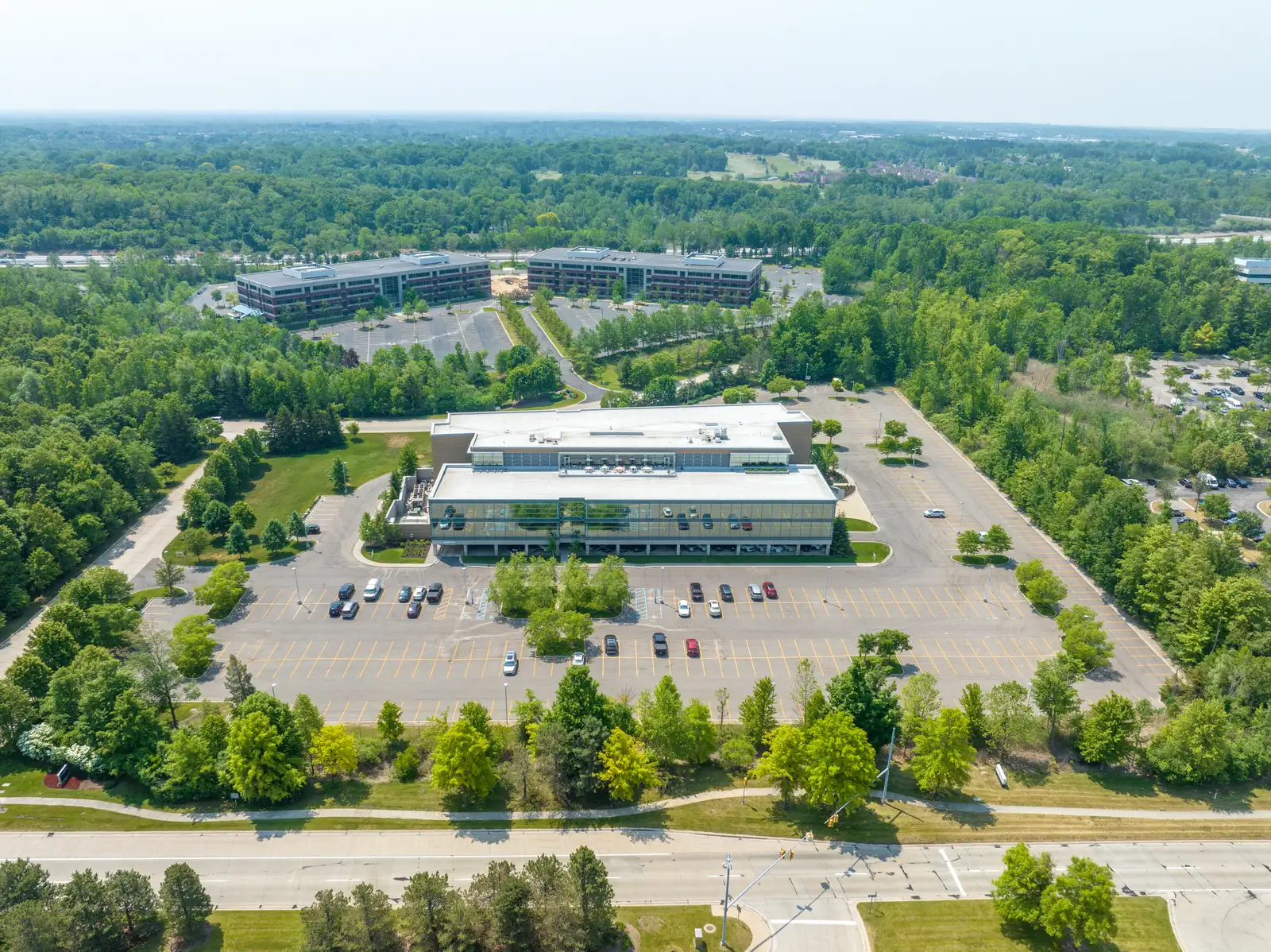 Spectacular, first-class office building for sale or lease in prestigious wooded office park setting in prime Farmington Hills location. Stunning café and conference center, covered parking and fitness center. Next to Mercedes-Benz and Comerica's new campuses.
