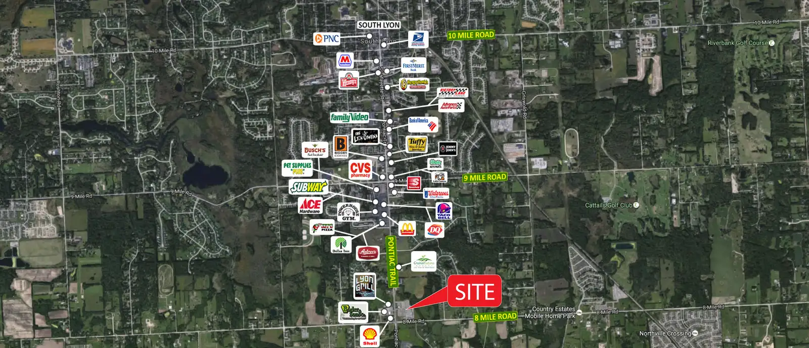 • Located at the northeast quadrant of 8 Mile Road and Pontiac Trail in South Lyon MI – just south of Downtown South Lyon in a growing high-income residential area