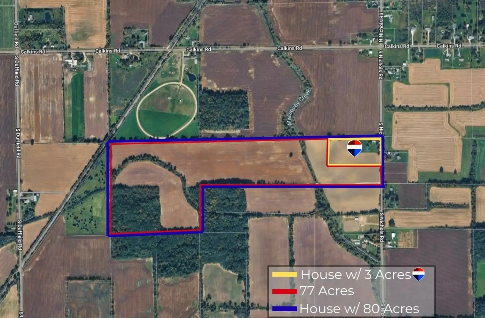 Charming farmhouse set on a picturesque 80-acre parcel featuring a mix of tillable land, wooded acreage, and a peaceful creek winding through the property. This 4-bedroom home offers timeless character and a spacious footprint, ready to be reimagined into something truly special! With solid bones and classic architectural appeal, this is the perfect opportunity for those with an HGTV vision. Recent exterior updates include 2023 metal roof, windows, and siding, and the property also features a barn with metal roof and additional outbuildings ideal for hobby farming, storage, or endless possibilities. Enjoy wide-open views and a serene country setting with expansive potential. Flexible acreage options available; contact listing agent for details. 63 acres tillable land, leased for the season. 14 acres of woods at back of parcel. Creek/Drain running through property. Home & Barn can be split off to +/- 3 acres if desired.