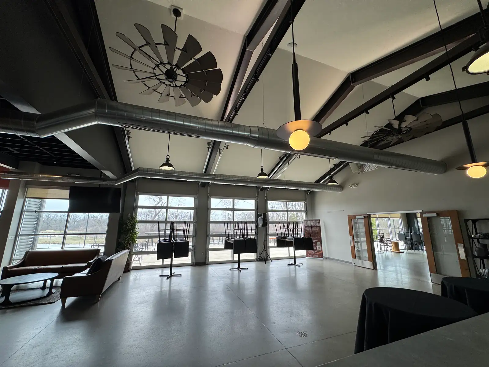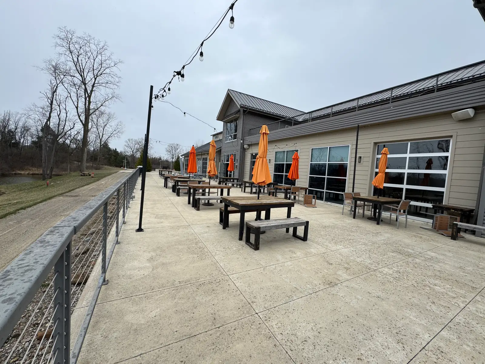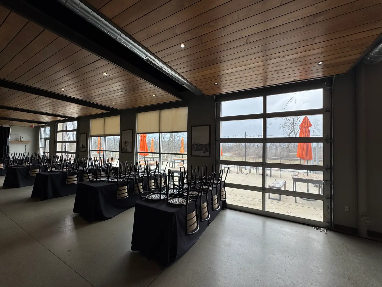• Outdoor patio seating area (155’ x 30’) with additional seating for 150, seamlessly connected to the interior dining and bar area by five roll-up glass garage doors open to the outdoor dining space, providing scenic views of two ponds.