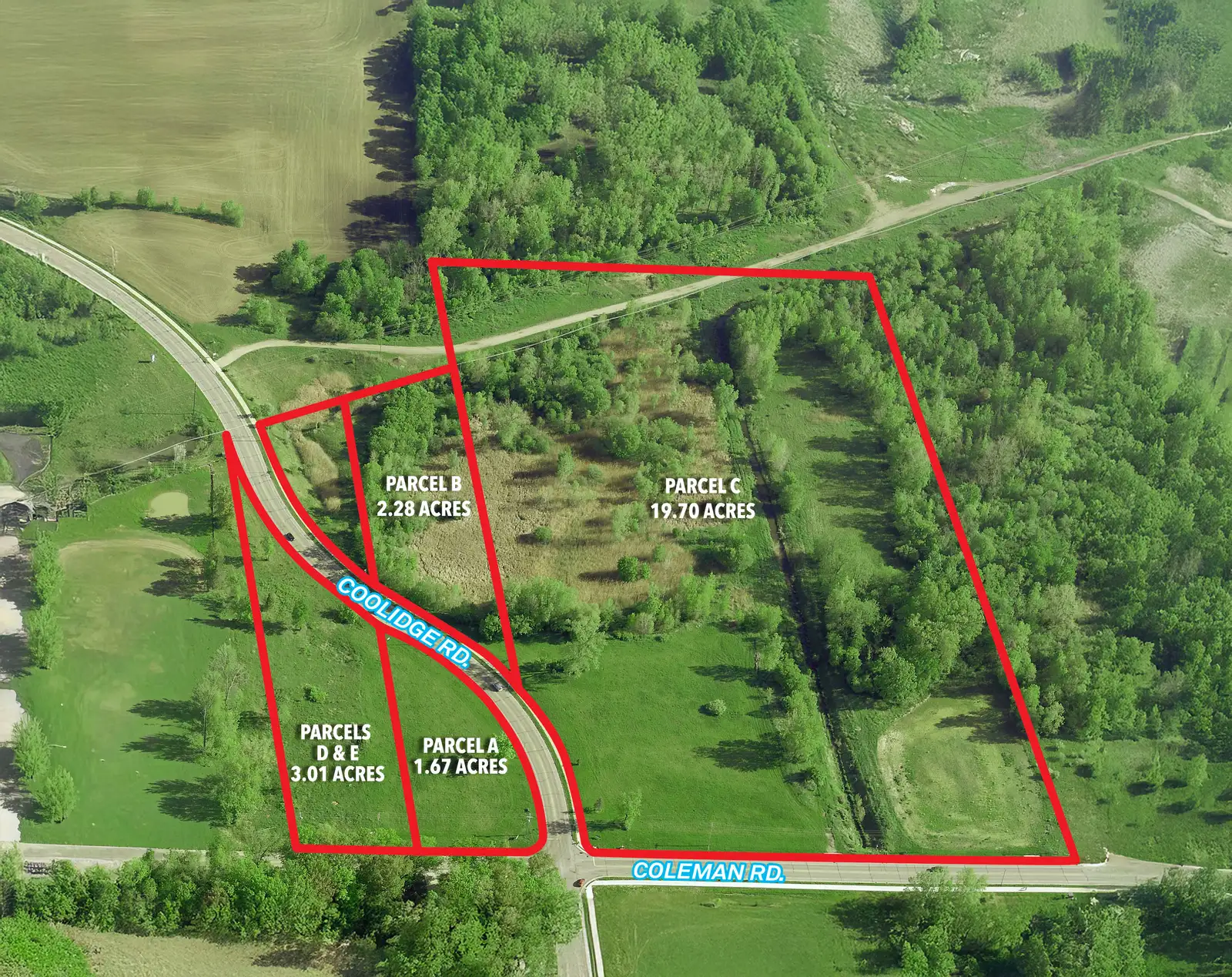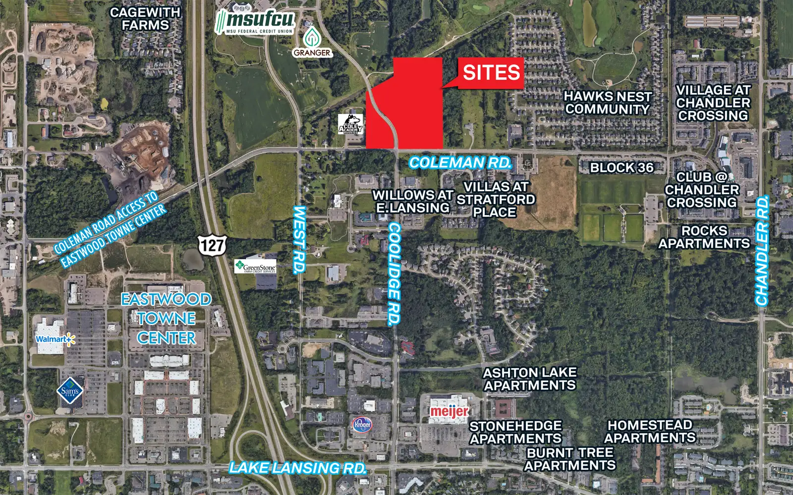 COMMERCIAL & MIXED-USE DEVELOPMENT OPPORTUNITY | 3.01–19.7 ACRESColeman Corners presents a rare opportunity to acquire up to 19.7 acres of prime land in East Lansing’s northwest tier, just southeast of the MSU Federal Credit Union campus. With parcels ranging from 3.01 to 19.7 acres, this site is ideally suited for commercial or mixed-use development, supported by a master plan and access to all utilities.