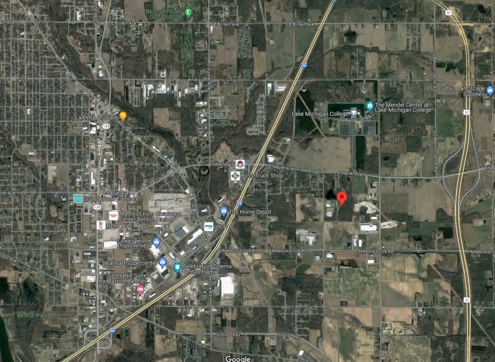 L-shaped land parcel offering over 25 acres in Benton Charter Township in Berrien County. Located just off East Napier Avenue, with entrance drive off Dewey Avenue. Bordered by several industrial users, farmland and an event center on Napier. Close proximity to I-94. This parcel has been owned by the same family for decades, and they have priced it to sell as they are no longer in the area. Property offers a number of possibilities for use.