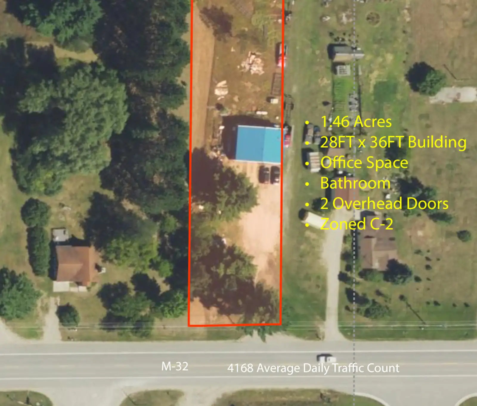 Ready to take your business to the next level? This 1090 sqft building has tones of potential. 100 ft frontage on M-32 on the west side of Atlanta, MI. A functional layout with office space & bathroom/mechanical room on one side & warehouse space/bay area on the other. The bay area has 2 overhead doors (10x12 & 12x12). 6'' concrete floors & overhead storage above the office/bathroom. Zoned C-2 (Heavy Commercial). Here are just a few uses allowed:microbreweries/distilleries, tasting rooms, agricultural nursery, animal groomer, equipment rental, auto repair, boat/rv repair/storage, firewood sales (large scale), retail sales, marihuana retailers, designated consumption establishments, manufacturing (special use permit maybe required). Full list of permitted uses can be supplied upon request.
