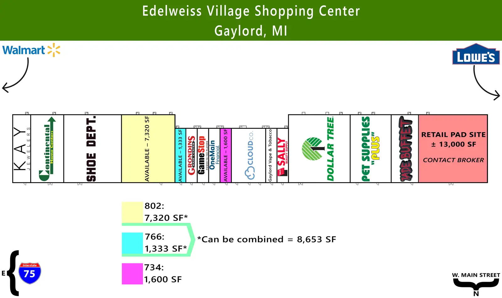 • Located on the west side of I-75 and the south side of Main Street on Edelweiss Village Parkway, between Walmart and Lowe's, in Gaylord, MI